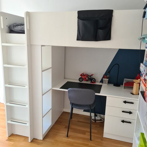 Obs by pris på denna säng är över 14000. Sängen hjälper dig spara golvyta i barnrummet genom att kombinera säng, skrivbord och förvaring - allt på en plats!