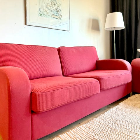 Vi säljer vår röda bäddsoffa som är 180 cm, och madrassen (själva sängen) är 140 cm i bredd.