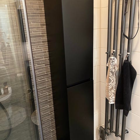 Hög och smal förvaringshylla med skåp i mörkgrå färg. Öppen hylla upptill och skåpsdel med dörr nedtill. Invändigt finns hyllplan för extra förvaring. Rektangulär toppskiva i mörk ton. Mått enligt ritning: cirka 90 cm hög, cirka 31 cm bred och djup. Passar till exempel i hall, badrum eller mindre utrymmen där smal förvaring behövs.