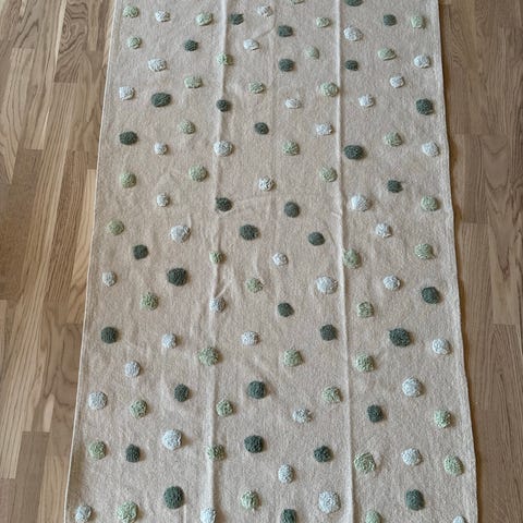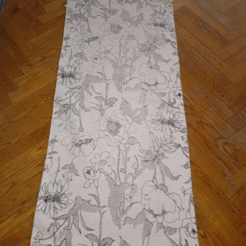 Matta med mönster i två färgställningar, beige med ljust mönster samt mörkgrå med ljust prickmönster. Rektangulär form som passar exempelvis vardagsrum, sovrum eller hall. Mönstrad yta på båda sidor ger ett dekorativt intryck och kan kombineras med olika inredningsstilar. Någon ljusgul färg från färgpenna på enstaka parti.