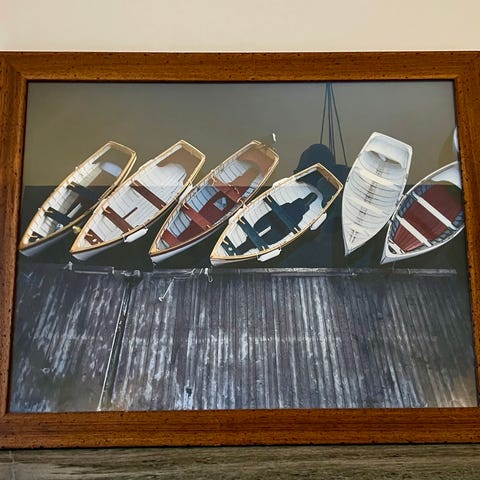 Tavla med motiv av små båtar i hamn, i liggande format. Bilden visar flera träbåtar vid brygga på vatten. Verket är inramat med passepartout och ram. Lämplig som väggdekoration i exempelvis vardagsrum, hall eller sommarstuga.