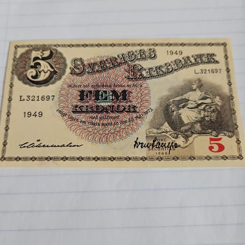 Sveriges riksbank 5-kronorssedel från 1949. Sedeln har valören fem kronor och är tryckt i flerfärg med dekorativt mönster, valörsiffra 5 i hörnen samt texten "Fem kronor" på framsidan. På baksidan finns porträtt av historisk person och valörangivelser. Passar för samlare av svenska sedlar och numismatik. Har skrift på baksidan högra hörnet, syns på bild.