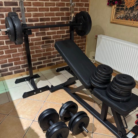 Träningsbänk med skivstång och hantlar svart