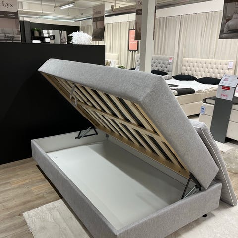 Säng med förvaring i storleken 90x200 cm. Sängen har uppfällbar ribbotten som ger ett rymligt förvaringsutrymme under madrassen. Klädd ram i ljusgrå textil. Passar som enkelsäng i sovrum, gästrum eller ungdomsrum. Mått enligt bild: längd ca 200 cm, bredd ca 90 cm, höjd ca 31 cm på sängramen.