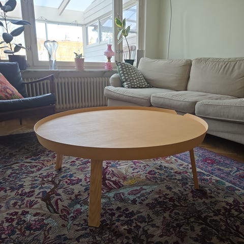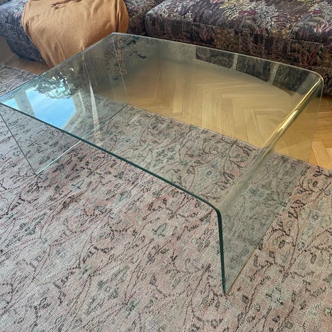 Säljer ett soffbord i ekfaner och glas från IKEA i nyskick.