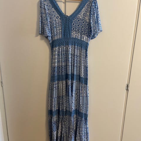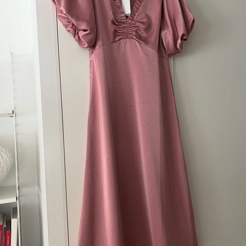 Klänningen är luftig, lätt, 93 % silk, 7 % elastane, knälång.