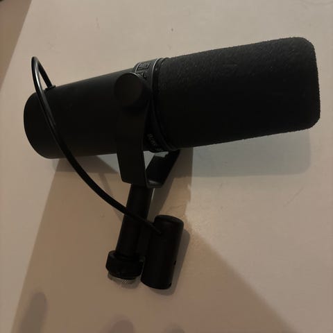 Shure SM7B dynamisk mikrofon i svart färg, avsedd för tal- och sånginspelning. Mikrofonen har integrerat fäste för montering på mikrofonstativ och inbyggt vindskydd. Golvstativ för mikrofonen finns.