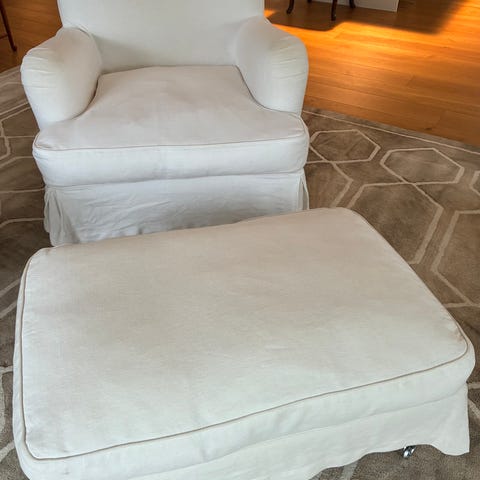 Fåtölj med fotpall, grå. Mycket gott skick, knappt använd. Inköpt på Severins i Halmstad. Modell Hans. Nypris 8690kr.