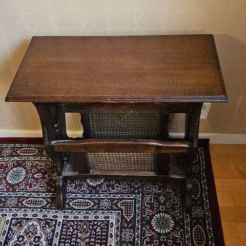 Rullvagn i rotting med tre hyllplan. Översta planet har tät flätning och de två nedre är öppna hyllor med ribbor. Vagnen står på hjul för enkel förflyttning. Passar som avlastningsbord eller förvaring i till exempel vardagsrum, kök eller hall.