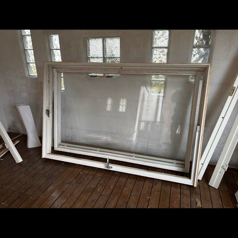 Fönster med frostat glas i vit karm. Fönstret är rektangulärt och har öppningsbeslag nertill. Passar exempelvis till badrum, källare eller andra utrymmen där insynsskydd önskas. Materialet ser ut att vara trä eller trä med beklädnad.