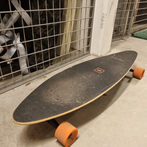 Sliten i både nose och tail men annars välbevarad för en longboard.