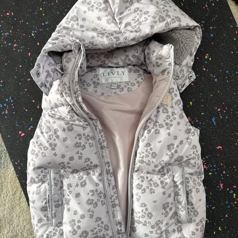 Grå vadderad väst med dragkedja fram och ett mönster av Musse Pigg. Västen har en huva med små öron.