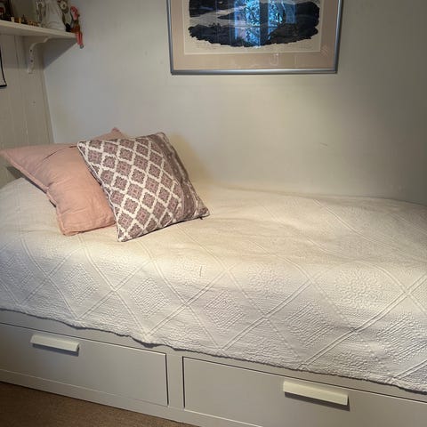 IKEA dagbädd i vit färg. Sängen har ribbotten i trä och utdragslådor undertill som ger extra förvaringsutrymme. 2 madrasser ingår ( se bild på en madrass). Passar som enkelsäng eller dagbädd i sovrum, barnrum eller gästrum.