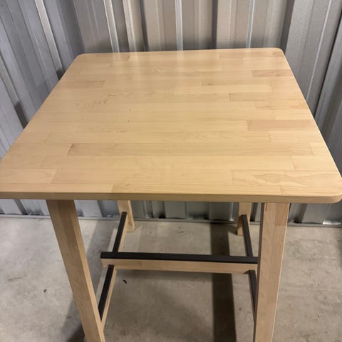 Vägghängt slagbord i trä som monteras på väggen med två konsoler och kan fällas ner när det inte används. Skivan har slagit sig något, men det går ändå bra att använda. Hämtas i Kärrtorp.