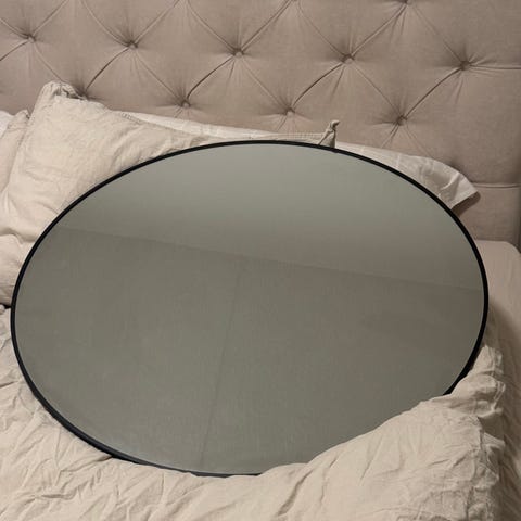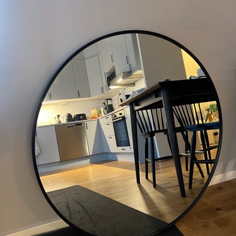 Rund spegel med svart ram. Mått: 85 cm