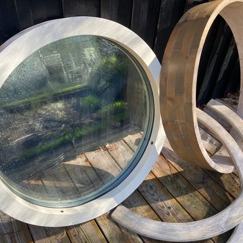 Runt fönster, ek, 54cm innerdiameter med tillhörande paneler och täcklister.