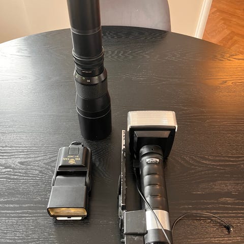 Diverse kameratillbehör samt en kikare. Samtliga modell äldre. Oklart skick.