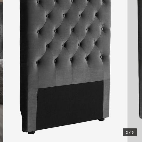 Jotex Huvud/ sänggavel i grå sammetstextil. Sänggaveln har knapptuftad framsida med mjuk stoppning och rak ovankant. Baksidan har etikett med skötselråd och information om material. Gaveln är avsedd att placeras bakom sängen mot vägg. Passar som ryggstöd vid läsning eller vila i sängen och ger ett enhetligt avslut på sängplatsen.
