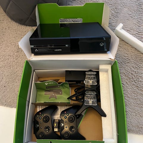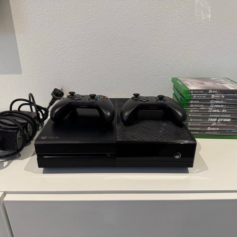 Microsoft Xbox One spelkonsol i svart färg. Konsolen levereras med två svarta trådlösa handkontroller enligt bilderna. Passar för spel, streaming och andra multimediafunktioner som stöds av Xbox One-systemet. Eventuella extra tillbehör eller spel framgår inte av informationen och kan därför inte garanteras.