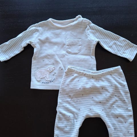 Ett set med babykläder bestående av en ärmlösbody, byxor med fötter, en omlott tröja med broderi, en haklapp och en mössa. Kläderna har ett diskret mönster.