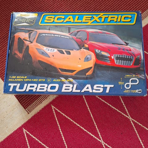 Möjlighet att bygga tre olika banor. Ena bilen provad och banan levererar ström, handkontrollerna fungerar. Däremot har däcken torkat sönder. Extra tillbehör "Strömflätor" medskickas.