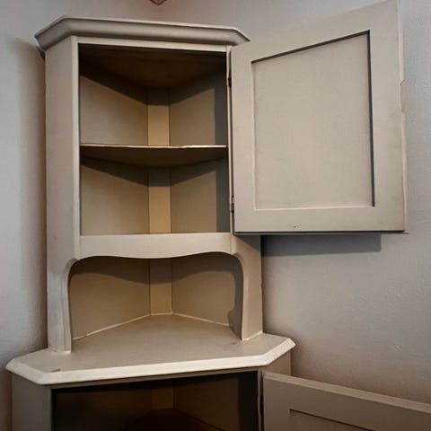 Ett sött och lättplacerat litet skåp med skjutdörrar. Är gissningsvis en dockgarderob från början.