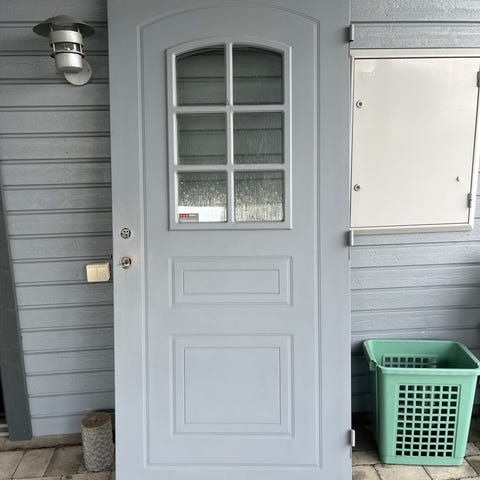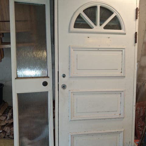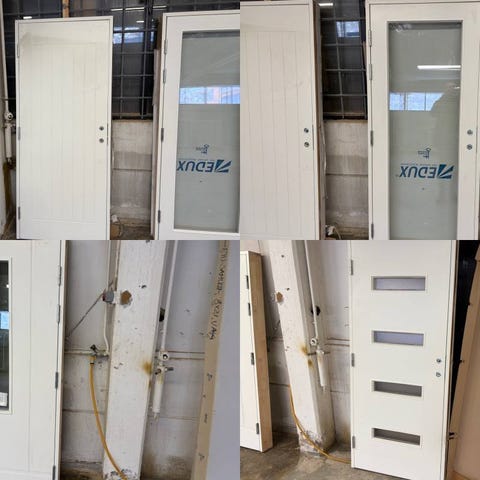 Ytterdörr i trä med fyrkantig glasruta monterad på diagonalmönstrad dörrspegel. Flera dörrar i liknande utförande, mestadels brunmålade samt en i klar träyta. Dörrarna har handtag och plats för låscylinder. Passar exempelvis som ytterdörr eller förrådsdörr där man önskar en enkel trädörr med glasinsläpp i överdelen.