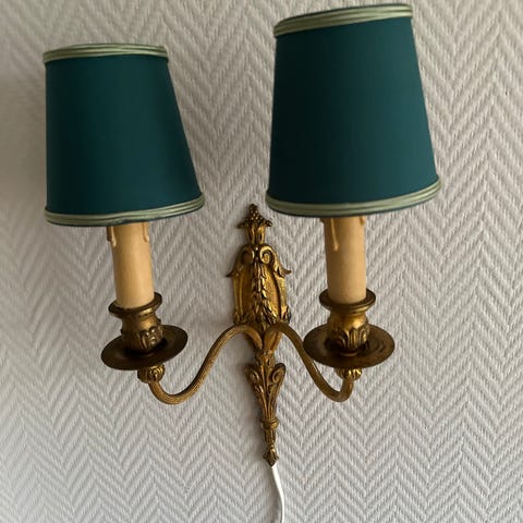 Vägghängda sänglampor i koppar, skärm klädd med tyg från Svenskt Tenn.