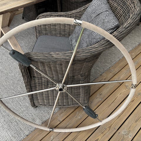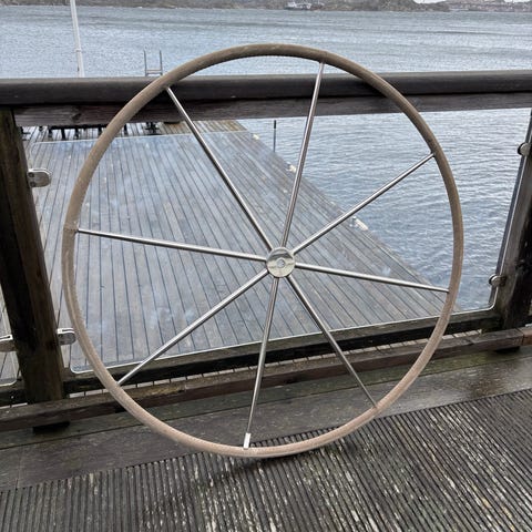 Enligt bild, okänt ursprung. Ca 900 mm i diameter, passar 25mm konisk axel, ”autopilotshjul” ca 260 mm.