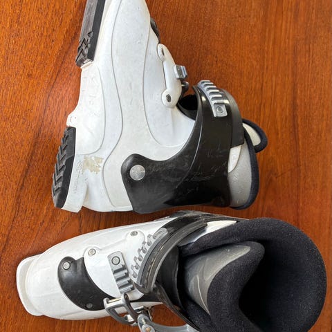 Nordica GP Team alpina pjäxor i blått, svart och grönt. Pjäxorna har fyra justerbara spännen och kraftigt kardborreband upptill för stabil passform. Storlek 230–235 med sulmått 278 mm, anpassade för barn eller mindre fötter. Invändigt finns vadderad innersko för komfort och stöd vid utförsåkning.