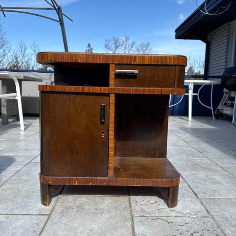 Det fina kuvertbordet i ek från början av 1900-talet saknar tyvärr beslagen för att ha klaffarna uppfällda, vilket behöver åtgärdas om bordet ska kunna användas som annat än sidobord. Även annars ett trevligt avställningsbord med hylla i smidig storlek.