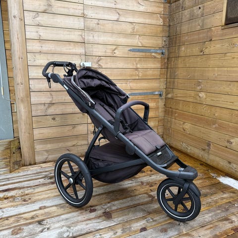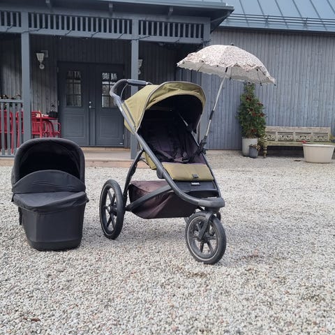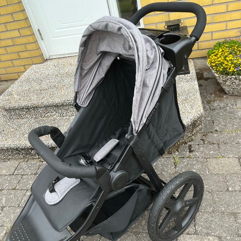 Säljer vår joggingvagn. Den är i använt skick och suffletten är lite solblekt. I övrigt är den felfri och rullar mycket lätt.