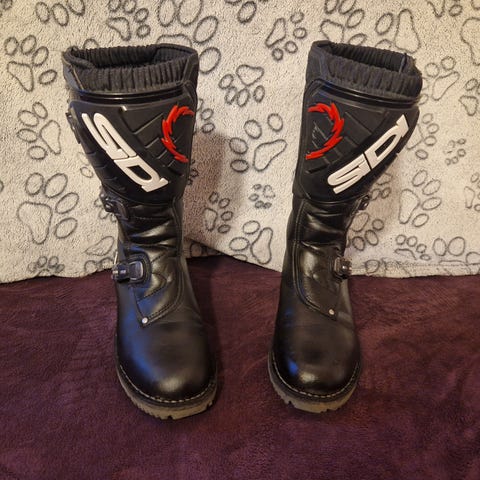 MC-stövlar i svart färg, storlek 42. Stövlarna är utformade för motorcykelkörning med förstärkningar och skydd på utsatta områden. Aldrig använda, provade 1 gång.