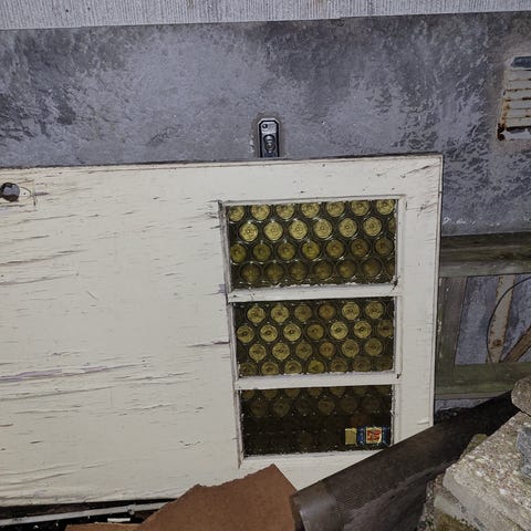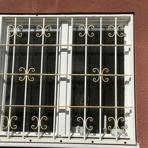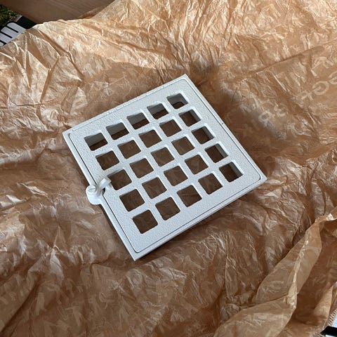Fyrkantigt galler i metall med rutmönster. Gallret är målat vitt och har flera fyrkantiga öppningar. Passar exempelvis för golvbrunn, ventilationsöppning eller liknande användningsområden där ett stabilt metallgaller behövs. Viss slitage och färgavflagning kan förekomma enligt bild.