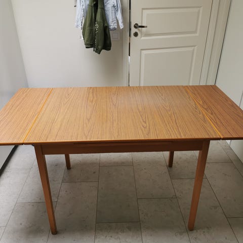 Gammalt fint matbord i massivt trä med iläggskiva och avtagbara ben. Tjänat oss väl i många år som huvudmatbord. Slitage och färgfläckar m.m. vi har tyckt att det varit charmigt. Går att slipa annars. se bilder för skick!