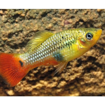 Orange/svart prickiga unga platys.