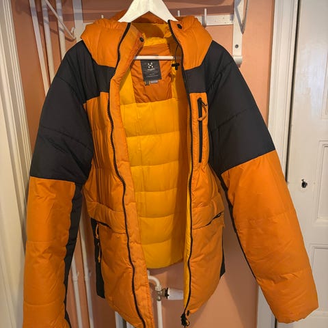 Haglöfs jacka för herr i storlek M. Jackan är orange och har huva. Material enligt uppgift är bomull. Passar som ytterjacka för vardag och utomhusaktiviteter. Dragkedja framtill och quiltad konstruktion för jämn fördelning av vaddering. Tillverkad i Vietnam enligt etikett.