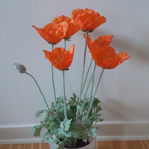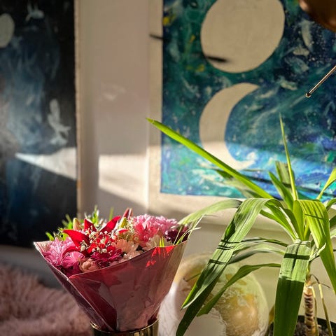 Krukor, växter, konstväxter, ljushållare, glasskålar, virkade filtar, dukar, tavlor m.m. Allt är i gott skick.