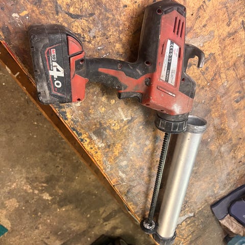 Milwaukee batteridriven fogpistol i röd färg.