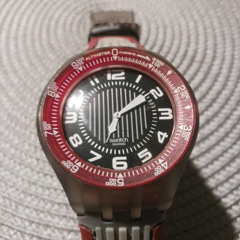 Swatch armbandsur för unisex med rött armband. Klockan levereras i originalförpackning enligt bilderna. Analog urtavla och klassisk Swatch-design, lämplig för vardagsbruk. Exakta modellbeteckningar och mått framgår av förpackningen på baksidan av klockan.