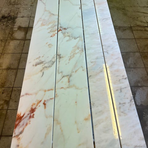 Marmorskiva i rektangulärt, avlångt format. Färg i gråvit marmor med naturligt ådringsmönster. Passar exempelvis som fönsterbräda eller hyllplan.