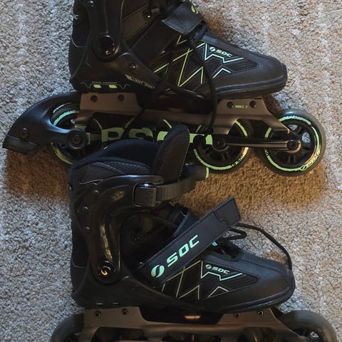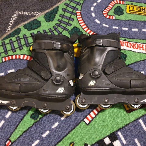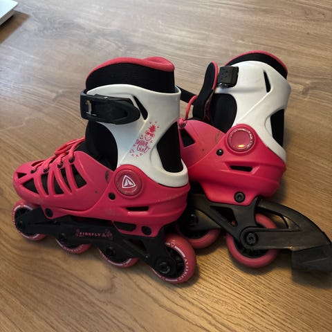 Justerbara i 4 storlekar (EU ca 32–36), rosa hjul, bra spännen, fin dämpning.