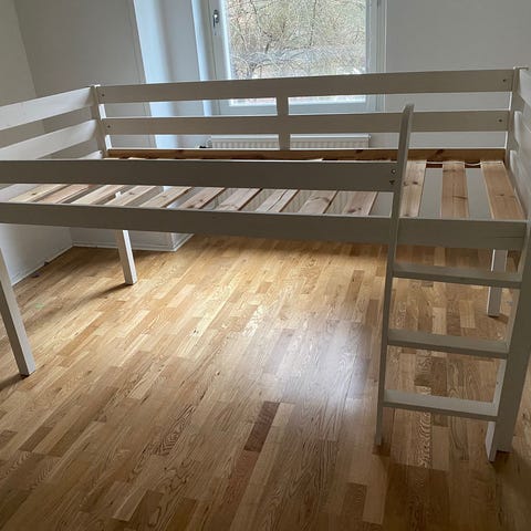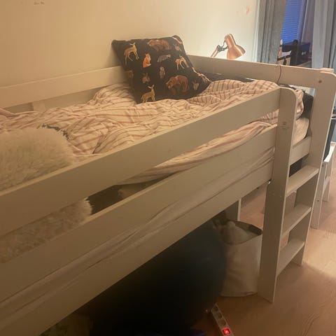 Säljer loftsäng som vi tror kommer från Oliver Furniture. Måtten 207x131x97 (BxHxD). Rymmer en 90x200 madrass som följer med. Madrassen är nytvättad. I helt ok skick, men synligt använd och skavmärken på vissa ställen. Detta har beaktats vid prissättningen. Levereras nedmonterad..