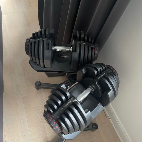 Dumbbell justerbara hantlar och träningsbänk i svart utförande.