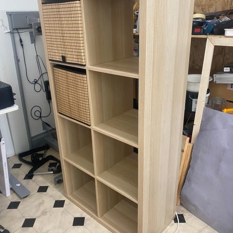 Hej. Den här hyllan har använts i ett par år men är välbevarad och jag tycker personligen att detaljerna på den ger ett fint intryck. Jag möblerar om och går därför vidare. Höjd 155 cm, bredd 65 cm, djup 20 cm.