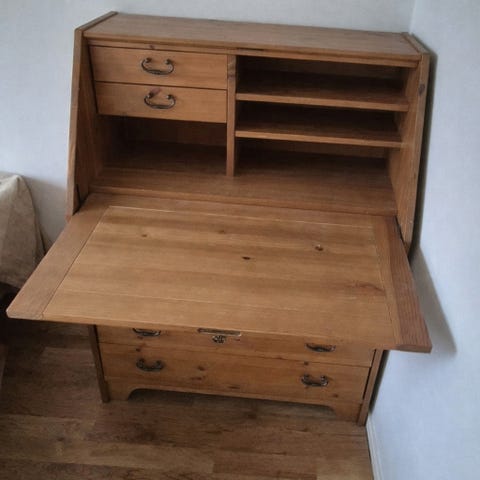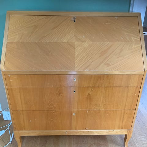 Säljer en gammal sekretär. Den går tyvärr inte att stänga helt, se bild. Ena handtaget finns med som man kan fästa. Behöver lite kärlek för den händige.