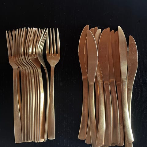 Säljer ett stilrent bestickset i guldfinish. Innehåller knivar, gafflar, matskedar och teskedar enligt bild. Fint skick och tål diskmaskin.