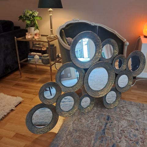 En blomliknande väggspegel i brunguldram. Väger inte mycket. Diameter 90 cm och djup 3 cm
