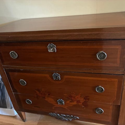 Tanken var att restaurera dessa, men pga flytt ändrade planer. Målad I antikvit matt färg, men med färglossningar på vissa ställen. Ena lådan behöver slipas för att stänga, men lätt att fixa för den händige. Resterande mässingbeslag finns i lådan.