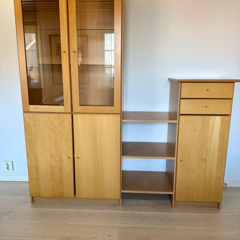 Ett fint vitrinskåp som sväljer mycket förvaring. Troligtvis IKEA. Kvistarna har blött igenom färgen lite på sina ställen, men vi har mest tyckt att det varit charmigt, men går givetvis att måla. Mått finns i bilderna.